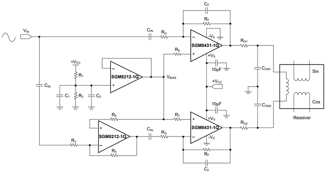 針對(duì)混合動(dòng)力汽車和電動(dòng)汽車中電機(jī)驅(qū)動(dòng)器的旋轉(zhuǎn)變壓器勵(lì)磁需求,SGM8431-1Q 以其高電壓和高輸出電流的特性,特別適合于這些應(yīng)用。在這些應(yīng)用中,SGM8431-1Q 能夠有效替代傳統(tǒng)的由運(yùn)算放大器和功率晶體管組成的復(fù)雜旋轉(zhuǎn)變壓器勵(lì)磁驅(qū)動(dòng)器,簡(jiǎn)化系統(tǒng)設(shè)計(jì)。