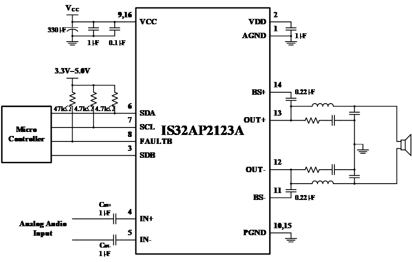 面對(duì)日益復(fù)雜的車載系統(tǒng)需求,絡(luò)明芯推出了一款符合AEC-Q100車規(guī)認(rèn)證的高性能、高可靠性、低功耗、大功率的單聲道D類音頻功放芯片IS32AP2123A。該芯片高達(dá)24W輸出功率,高信噪比,完善的故障檢測機(jī)制,以及創(chuàng)新的基于自動(dòng)增益控制(AGC)的輸出功率限制功能,不僅能保護(hù)揚(yáng)聲器,又能保證輸出音量和音質(zhì),非常適合AVAS應(yīng)用。IS32AP2123A典型應(yīng)用電路如圖2。