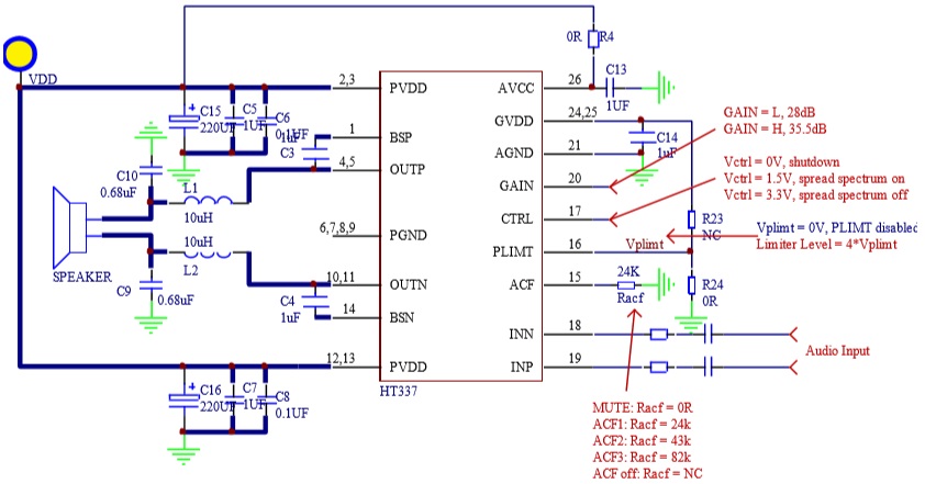 HT337具有防削頂失真(ACF)輸出控制功能,可檢測并抑制由于輸入音樂、語音信號幅度過大所引起的輸出信號削頂失真(破音), 也能自適應(yīng)地防止在電源電壓下降所造成的輸 出削頂,顯著提高音質(zhì),創(chuàng)造非常舒適的聽音享受,并保護(hù)揚(yáng)聲器免受過載損壞。