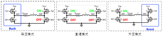 下圖(圖2)所示為 LT8210 電路在升、降壓及直通模式下的工作原理。在不同模式下,ADCD 四個(gè) MOSFET 的工作搭配方式是不同的。LT8210 將自動(dòng)控制它們不同的開關(guān)狀態(tài)、導(dǎo)通狀態(tài)、關(guān)斷狀態(tài),實(shí)現(xiàn)三種模式間的迅速切換。