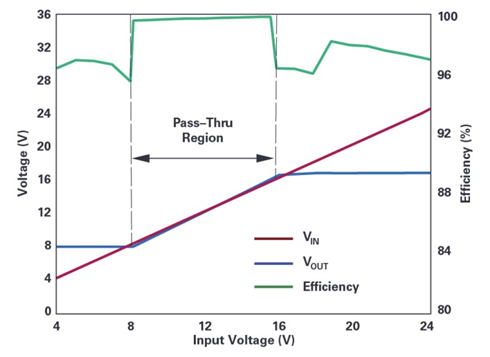 • 當(dāng)輸入電壓處于 8V-16V 這個(gè)設(shè)定的窗口電壓區(qū)間時(shí),電路進(jìn)入直通模式,輸出電壓將跟隨輸入電壓變化,此時(shí)效率為 99.9%
