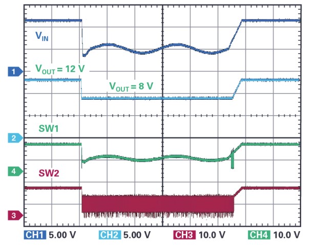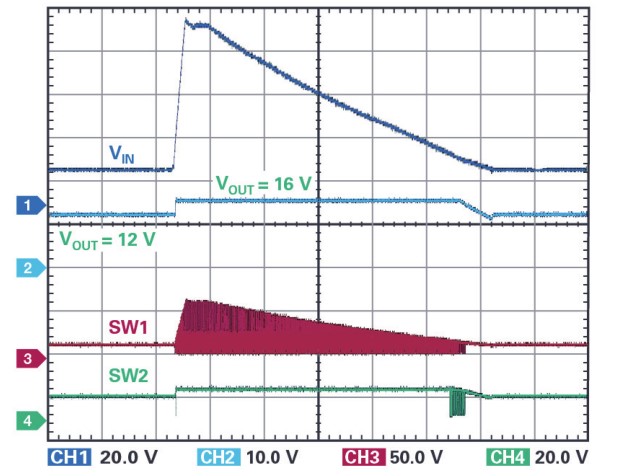 下圖(圖4、圖5)分別顯示了在輸入電壓突然激增(至80V)和突然跌落(至4V)的情況下,LT8210 對輸出電壓的穩(wěn)定作用,以及兩組開關(guān)電路的工作狀態(tài)變化。