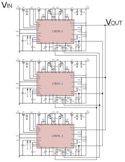 由于 LT8210 芯片的 MOSFET 驅(qū)動(dòng)能力是有限的,單個(gè)電路所能支持的最大工作電流取決于這些開關(guān) MOSFET 的能力。如果工程師需要設(shè)計(jì)更大電流的 LT8210 電路,可以選型即將發(fā)布的 LT8210-1 型號(hào),如下圖(圖7)所示,將多路 LT8210-1 的 VOUT 接在一起。另外,IMON 引腳、升降壓補(bǔ)償網(wǎng)絡(luò)也連接共享,可以實(shí)現(xiàn)最多 4 相的升降壓方案,達(dá)到千瓦級(jí)輸出功率。