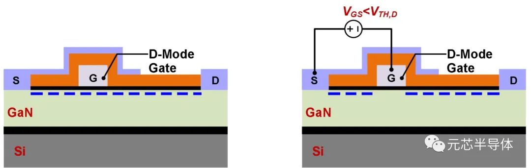 耗盡型 GaN 晶體管的物理結(jié)構(gòu)如圖 2 所示。在正常開關(guān)工作狀態(tài)下,如圖 2(a) 所示,由于 GaN 晶體的固有特性和耗盡型柵極材料,柵極偏置電壓為零時(shí),耗盡型GaN晶體管處于自然導(dǎo)通狀態(tài)。而關(guān)閉耗盡型 GaN 器件需要在柵極 (G) 和源極 (S) 之間施加負(fù)偏置電壓VGS。當(dāng) VGS 低于 GaN 晶體管的開啟閾值 VTH, D (VGS<VTH, D) 時(shí),導(dǎo)電溝道被切斷,晶體管關(guān)閉,如圖 2.2(b) 所示。在此期間,漏源電壓(VDS)可以維持非常高的擊穿電壓。然而,對(duì)于耗盡型 GaN 晶體管,需要負(fù)柵極驅(qū)動(dòng)電壓VGS來關(guān)閉晶體管,這使得 GaN 柵極驅(qū)動(dòng)電路的設(shè)計(jì)變得更加復(fù)雜。