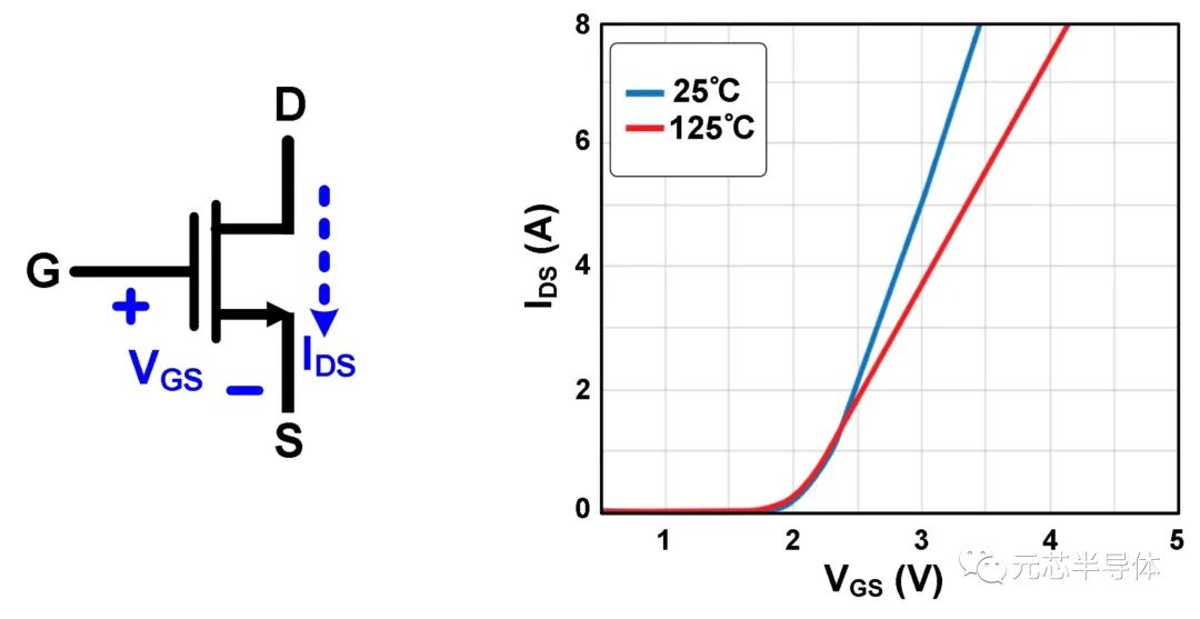 為了闡明增強(qiáng)型 GaN 晶體管的工作原理,圖 4 展示了傳輸特性曲線。在 VGS 達(dá)到接近 1.7V 后,晶體管開始導(dǎo)通。由于 GaN 材料具有高電子高遷移率,GaN 晶體管表現(xiàn)出高跨導(dǎo)增益和大電流傳導(dǎo)能力。例如,在 3V 的 VGS 下,典型的 GaN 晶體管可以傳導(dǎo) 5A 的飽和電流 IDS。此外,GaN功率晶體管的飽和電流隨溫度增加呈現(xiàn)負(fù)溫度系數(shù),這可以保護(hù)功率器件在高溫大功率工作情況下免受永久性損壞。