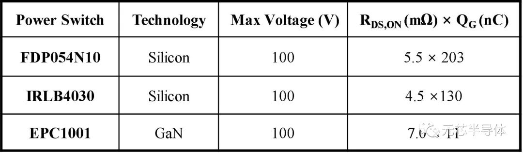 為了比較 GaN 晶體管與硅晶體管的柵極電容,選取了幾款典型器件并對(duì)它們的柵極電荷 QG 參數(shù)進(jìn)行比較,如表 1中所示。與傳統(tǒng)的硅器件相比,GaN 器件具有寬禁帶電壓和高電子遷移率。在100V 耐壓和相同的導(dǎo)通電阻 RDS(ON) 情況下,GaN 晶體管的柵極電荷比硅器件小了 12 倍,這使得GaN器件成為高頻高效率開關(guān)電源系統(tǒng)中理想的開關(guān)功率器件。