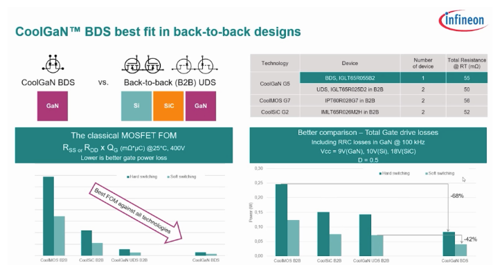 圖2:與SI和SIC MOSFET背對(duì)背配置的HV Coolgan BDS設(shè)備的損耗比較(來(lái)源:Infineon Technologies)