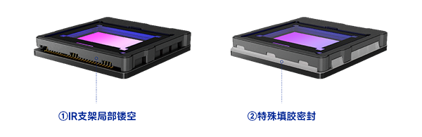 而TCOM在實(shí)現(xiàn)小型化設(shè)計(jì)的同時(shí),兼具了性能和成本上的優(yōu)勢(shì)。首先,改善支架設(shè)計(jì)。在連接CIS與FPC電路板的金線兩側(cè),IR支架局部鏤空,寬度縮短約10%。然后采用獨(dú)特的填膠工藝和設(shè)備,在元器件放置兩側(cè)、IR支架與元器件之間,按一定角度完成填膠密封。