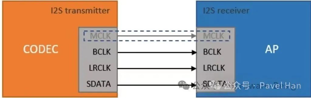 I2S(Inter-IC Sound)是一種同步串行接口,專門(mén)用于音頻數(shù)據(jù)的傳輸,具有簡(jiǎn)單、高效和抗干擾能力強(qiáng)的特點(diǎn)。I2S接口傳輸?shù)氖菙?shù)字音頻數(shù)據(jù),通常以PCM(脈沖編碼調(diào)制)格式表示,實(shí)際上也就是Audio Codec中從麥克風(fēng)采集語(yǔ)音數(shù)據(jù)經(jīng)過(guò)AD轉(zhuǎn)換后的數(shù)字音頻數(shù)據(jù),或者從DSP接收到的、需要通過(guò)Audio Codec進(jìn)行DA轉(zhuǎn)換后在揚(yáng)聲器播放出來(lái)的數(shù)字音頻數(shù)據(jù)。