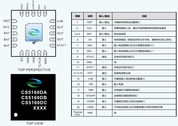 CS5160D具有完善的保護(hù)功能,包括輸入欠壓和過(guò)壓保護(hù)、輸出欠壓和過(guò)壓保護(hù)、芯片溫度調(diào)節(jié)和保護(hù),充電超時(shí)保護(hù)、電池過(guò)壓和短路保護(hù)、電池溫度保護(hù)。此外芯片通過(guò)外接的兩路LED指示燈,可對(duì)充電過(guò)程實(shí)現(xiàn)全程監(jiān)控。