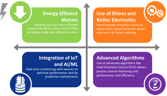 電機(jī)能效的主要發(fā)展趨勢之一是從傳統(tǒng)電機(jī)(如交流感應(yīng)電機(jī))向更高效的類型過渡,包括無刷直流電機(jī)(BLDC)、永磁同步電機(jī)(PMSM)和內(nèi)置式永磁電機(jī)(IPM)。這些電機(jī)具有更高效率和更優(yōu)性能。此外,材料技術(shù)的進(jìn)步(如非晶金屬和稀土磁體的應(yīng)用)進(jìn)一步提升了電機(jī)效率。