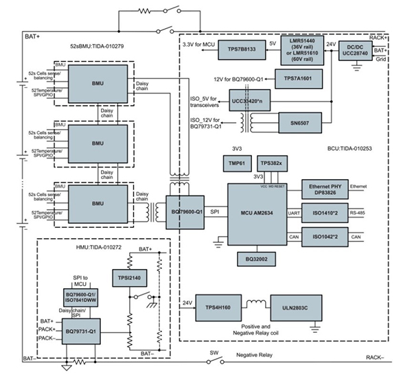 圖 2. 適用于儲能系統(tǒng)參考設計的電池控制單元參考設計圖(顯示了可堆疊 BMU 架構)
