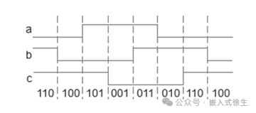 在無刷電機(jī)中一般把3個霍爾傳感器間隔120°的圓周分布安裝如圖所示。輸出信號高低電平各占180°角。設(shè)輸出的高電平為1,低電平用0表示,則輸出三個信號用二進(jìn)制編碼表示如上表。