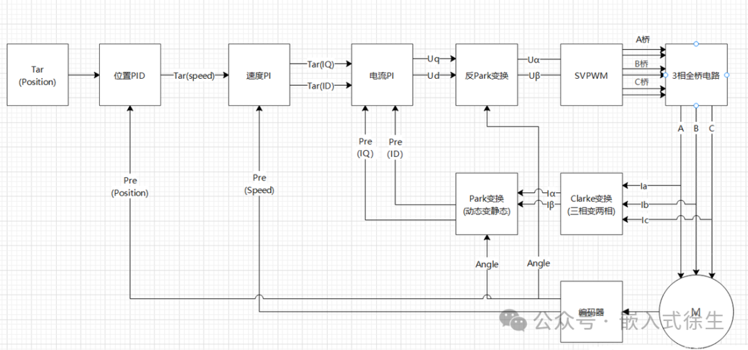 FOC控制無刷電機(jī)過程,通過對無刷電機(jī)的三相電流采樣進(jìn)行Clarke變換,將三相正弦電流信號轉(zhuǎn)換為兩相正弦信號,再經(jīng)Park變換(旋轉(zhuǎn)變換),轉(zhuǎn)換為兩個直流信號作為電流閉環(huán)的輸入,再經(jīng)反Park變換和空間矢量脈寬調(diào)制控制三相全橋的開斷,從而實(shí)現(xiàn)無刷電機(jī)的控制。