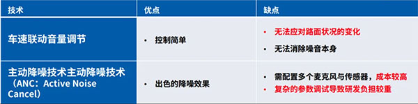 應(yīng)對音響環(huán)境變化,直接的方法就是用戶手動調(diào)節(jié)音量。然而,在持續(xù)變化的路面環(huán)境下頻繁調(diào)節(jié)音量,會很大程度影響用戶體驗。針對這一問題,典型的現(xiàn)有技術(shù)——車速聯(lián)動音量調(diào)節(jié)和ANC雖對車內(nèi)音響控制有所貢獻,但各自仍存在挑戰(zhàn)。