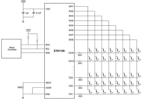 ET61128的工作電壓為2.7~5.5V,最大支持16×8陣列顯示,可驅(qū)動(dòng)128個(gè)LED,16路恒流輸出,電流最大達(dá)49.2mA,通過(guò)外接電阻可以靈活調(diào)節(jié)輸出電流。芯片支持全局32檔電流調(diào)節(jié),以及每通道4檔獨(dú)立微調(diào),能夠精準(zhǔn)匹配多樣LED負(fù)載。每點(diǎn)還支持256級(jí)PWM精細(xì)調(diào)光,實(shí)現(xiàn)平滑漸變與動(dòng)態(tài)效果,提升用戶體驗(yàn),滿足多樣化亮度需求。