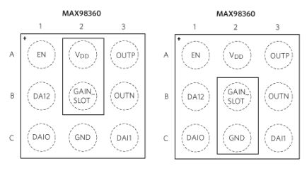 該 IC 還具有其他一些顯著優(yōu)勢,有助于最大限度地減小電路板尺寸/成本。首先,它有1.9毫米的微小尺寸。29 引腳 WLP 具有巧妙的引腳布局,旨在消除對昂貴電路板過孔的需求。如圖4所示,GAIN_SLOT引腳(位于封裝中心)可以方便地連接到VDD或 GND(直接或使用電阻器)或保持未連接狀態(tài),以提供 I2S/左對齊增益設置如表1所示。