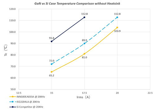 在相同散熱條件下,GaN器件溫度比Si方案低23℃以上;在18A以下相電流時(shí),合封GaN方案可無(wú)需散熱器,極大減小系統(tǒng)體積。