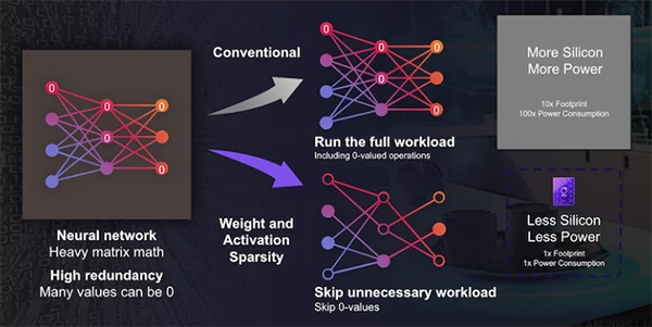 該公司已為客戶創(chuàng)建了大部分人工智能應(yīng)用棧。當(dāng)然,您也可以使用通用神經(jīng)網(wǎng)絡(luò)處理器(NPU)知識(shí)產(chǎn)權(quán),花費(fèi)大量令人疲憊、令人頭疼的工程時(shí)間來構(gòu)建類似的稀疏耳機(jī)應(yīng)用棧、工具鏈、編譯器和指令集。無論哪種方式,只有當(dāng)稀疏性從訓(xùn)練到打包再到運(yùn)行時(shí)端到端實(shí)現(xiàn)時(shí),才能獲得收益。