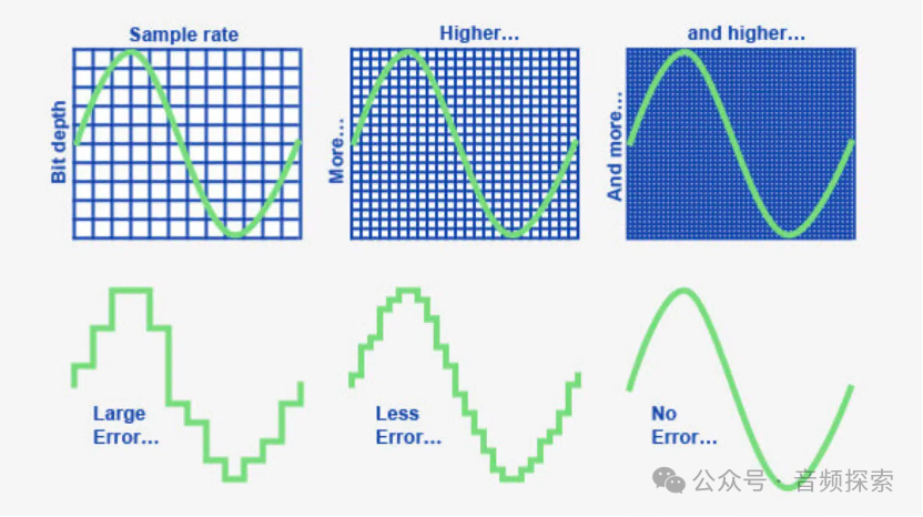 上一篇文章我們介紹到數(shù)字信號(hào)只能用有限的0/1的組合來表示無限的模擬信號(hào),所以必須通過采樣率(Sample Rate)和比特深度(Bit Depth)來完成量化。那么什么是采樣率和比特深度?
