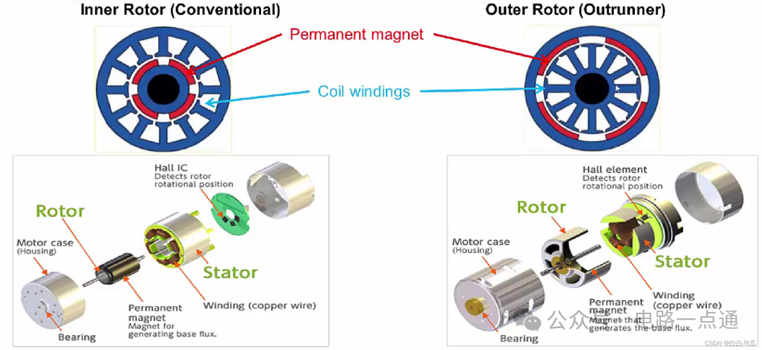就BLDC自身結(jié)構(gòu)而言,可分為內(nèi)轉(zhuǎn)子和外轉(zhuǎn)子兩種: