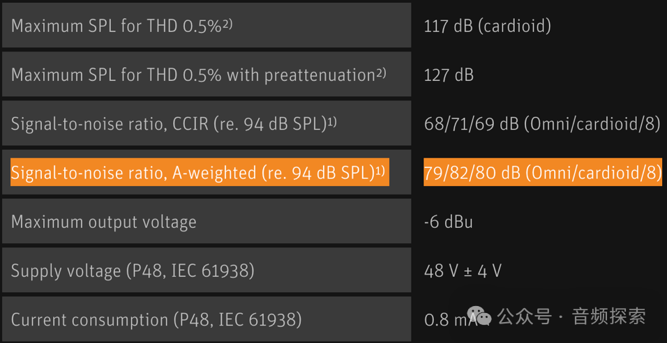 此外,信噪比和自噪聲(Self Noise)可以互相換算。廠商通常以94dB SPL(1Pa)作為參考:
