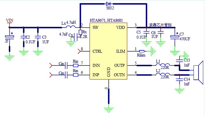 HTA8681內(nèi)置的升壓,提供8.5V最大輸出電壓。其小音樂信號時不升壓,僅當功率較大時,提供升壓后的電壓給D類功放,其可大幅提高系統(tǒng)效率,延長電池續(xù)航時間。