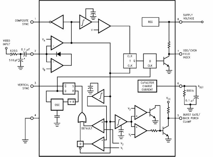 芯片也可以用于非標(biāo)準(zhǔn)或者行頻速度更快的視頻信號(hào)。標(biāo)準(zhǔn)視頻信號(hào)的場脈沖輸出開始于輸入信號(hào)的場脈沖沿,而當(dāng)輸入的是非標(biāo)準(zhǔn)視頻信號(hào)時(shí),場脈沖輸出在特定延遲后發(fā)生。