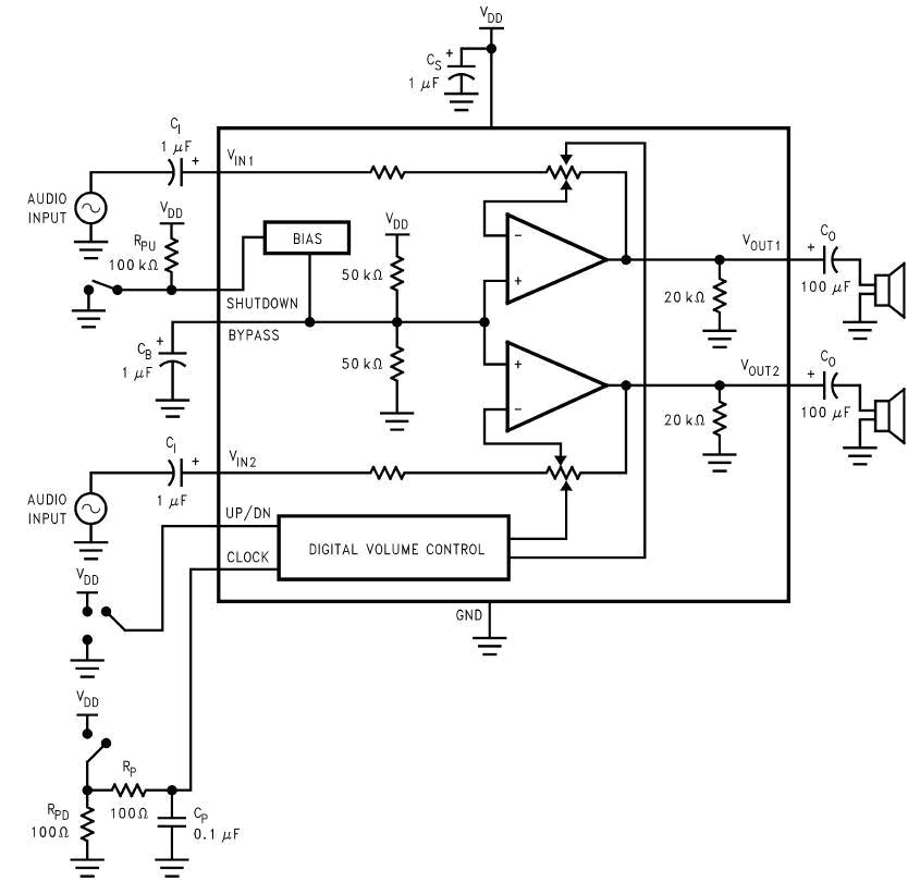 CP4811帶有數(shù)字音量調(diào)節(jié)功能,能通過兩個輸入端調(diào)節(jié)增益在+12dB 和-33dB之間變化,共有16種增益變化。AT4811帶有低功耗模式,關(guān)斷信號高有效;芯片內(nèi)部也有一溫控電路,實現(xiàn)熱保護(hù)功能。