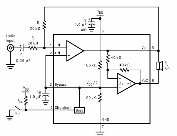 4871D是一個BTL橋連接的音頻功率放大器。它能夠在5V電源電壓下給一個4Ω負載提供THD小于10%、平均值為3.2W輸出功率。在關閉模式下電流的典型值為0.6μA。4871D是為提供大功率,高保真音頻輸出而專門設計的。它僅僅需要少量的外圍元件,并且能工作在低電壓條件下(2.0V-6.5V)。4871D不需要耦合電容,自舉電容或者緩沖網(wǎng)絡,所以它非常適用于小音量和低重量的低功耗系統(tǒng)。