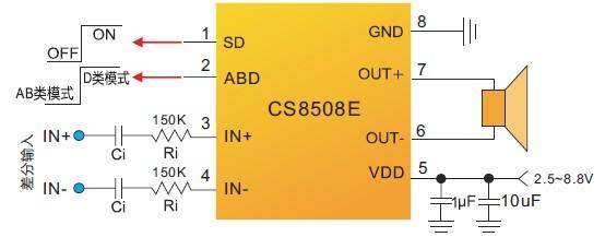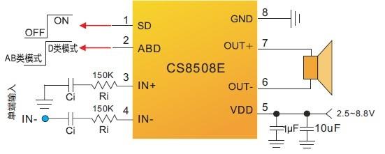 CS8508E的全差分架構(gòu)和極高的PSRR有效地提高了對(duì)RF噪聲的抑制能力,并且省去了傳統(tǒng)音頻功放的BYPASS電容。