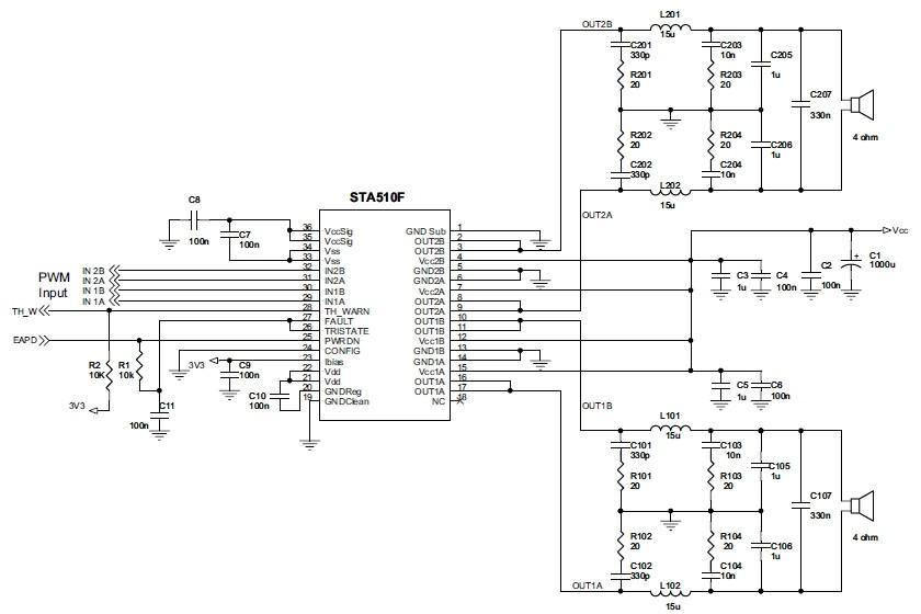 STA510F是為配合ST其它系列的采用ST獨有的FFX(全靈活放大)數(shù)字調(diào)制技術的產(chǎn)品而專門設計的,但是也支持其它品牌的采用任何一種PWM調(diào)制方案(如三值增量、相移或二值增量調(diào)制技術)的驅(qū)動器。這款功放芯片確保全部PWM輸入信號的音質(zhì),同時還為家庭影院系統(tǒng)、微型組合音響系統(tǒng)等要求嚴格且注重成本的產(chǎn)品提供了一個成本效益非常高的功率輸出級解決方案。