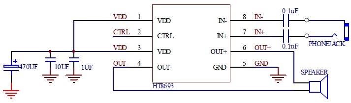 HT8693內(nèi)部集成免濾波器數(shù)字調(diào)制技術(shù),能夠直接驅(qū)動(dòng)揚(yáng)聲器,并最大程度減小脈沖輸出信號(hào)的失真和噪音。輸出無需濾波網(wǎng)絡(luò),極少的外部元器件節(jié)省了系統(tǒng)空間和成本,是便攜式應(yīng)用的理想選擇。此外,HT8693內(nèi)置的關(guān)斷功能使待機(jī)電流最小化,還集成了輸出端過流保護(hù)、片內(nèi)過溫保護(hù)和電源欠壓異常保護(hù)等功能。