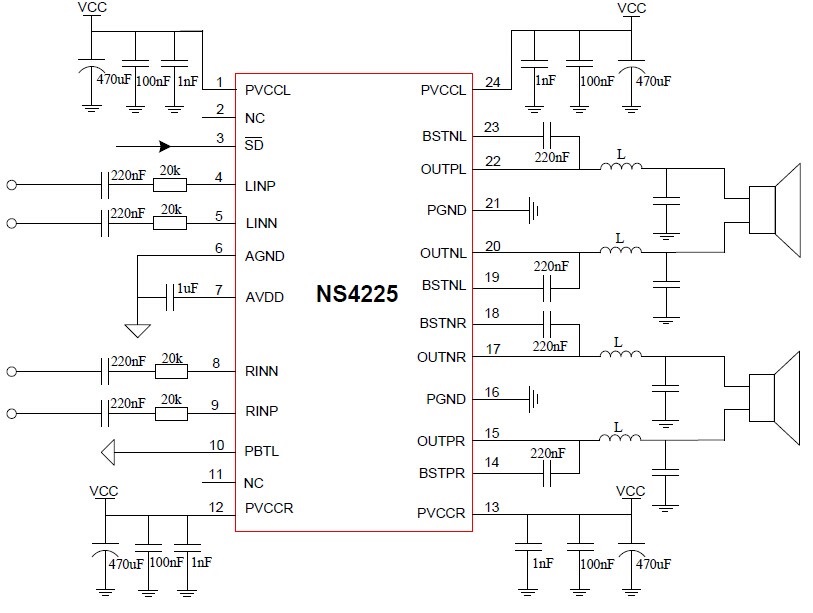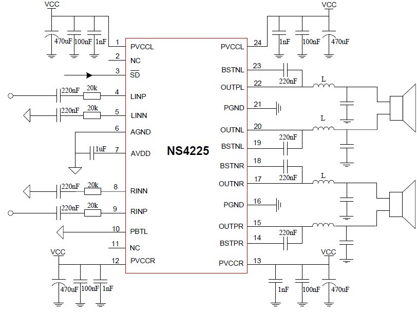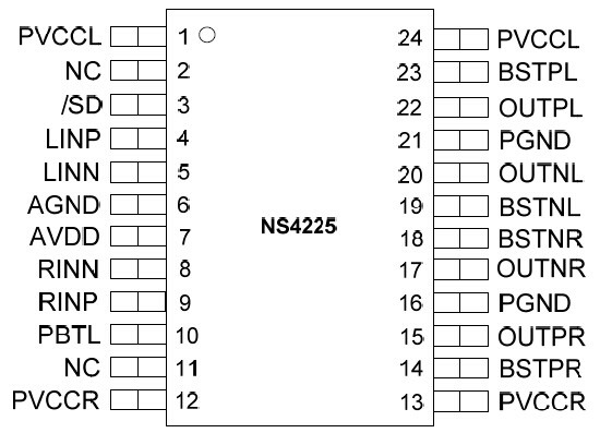 NS4225(雙聲道2X25W、單聲道50W、D類音頻功放IC) |