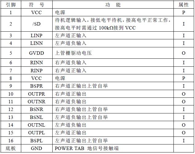 2×20W (VDD=14.5V, RL=4Ω, THD+N=1%) 或2×25W (VDD=14.5V, RL=4Ω, THD+N=10%) |