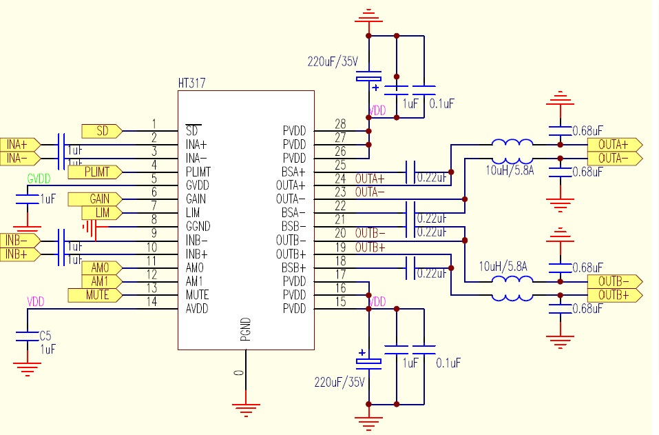 HT317是一款高效D類音頻功率放大器。在BTL模式,能夠提供2*30W/8Ω功率輸出;在PBTL模式,能夠提供75W/4Ω功率輸出。