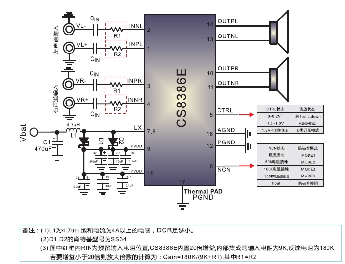 擴頻模式,靜音功能,三種防破音模式,AB/D切換,內(nèi)置升壓,18W單聲道音頻功放 |