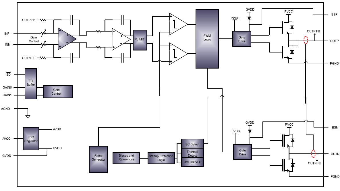 動態(tài)調(diào)整升壓CLASS H功能、25W雙聲道/50W單聲道D類音頻功放IC |