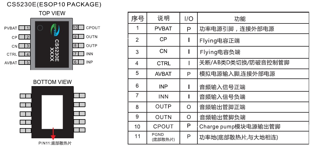 CS5230E提供了ESOP10的封裝類型,其額定的工作溫度 范圍為-40℃至85℃。