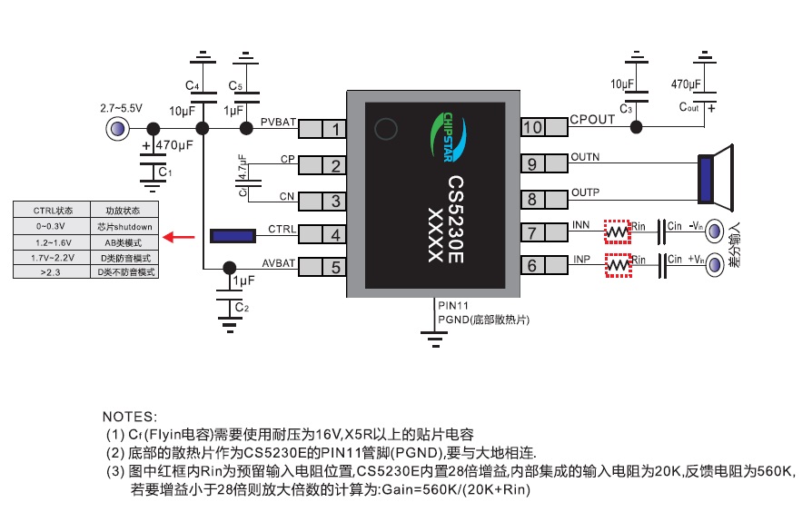 CS5230E是一款采用CMOS工藝,電容式升壓型GF類單聲道音頻功放,可以為4Ω的負(fù)載提供最高5W的連續(xù)功率;CS5230E芯片內(nèi)部固定的28倍增益,有效的減少了外圍元器件的 數(shù)量;功放集成了D類和AB類兩種工作模式即可保證D類模式下強(qiáng)勁的功率輸出,又可兼顧系統(tǒng)在有FM的情況下,消除功放對(duì)系統(tǒng)的干擾;CS5230E具有獨(dú)特的防破音(NCN)功 能,可根據(jù)輸出信號(hào)的大小自動(dòng)調(diào)整功放的增益,實(shí)現(xiàn)更加舒適的聽(tīng)覺(jué)感受,CS5230E還具備電源自適應(yīng)能力,當(dāng)電源電壓低的時(shí)候,功放會(huì)自動(dòng)降低增益,從而減少功放的輸出功率. CS5230E的外圍只有低成本的阻容器件,在以鋰電池供電的移動(dòng)式音頻設(shè)備中,CS5230E是理想的音頻子系統(tǒng)的功放解決方案.CS5230E的全差分架構(gòu)和極高的PSRR有 效地提高了CS5230E對(duì)RF噪聲的抑制 能力。另外CS5230E內(nèi)置了過(guò)流保護(hù),短路保護(hù)和過(guò)熱保護(hù),有效的保護(hù)芯片在異常的工作條件下不被損壞。