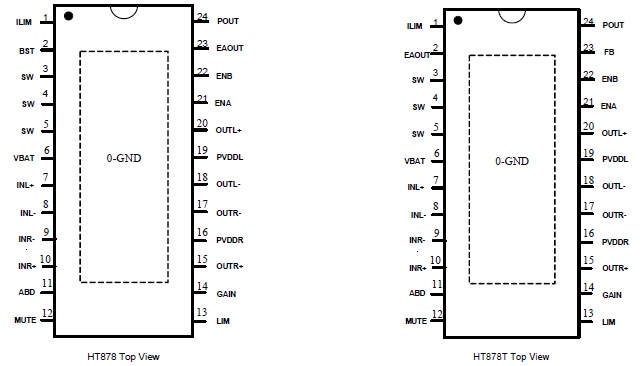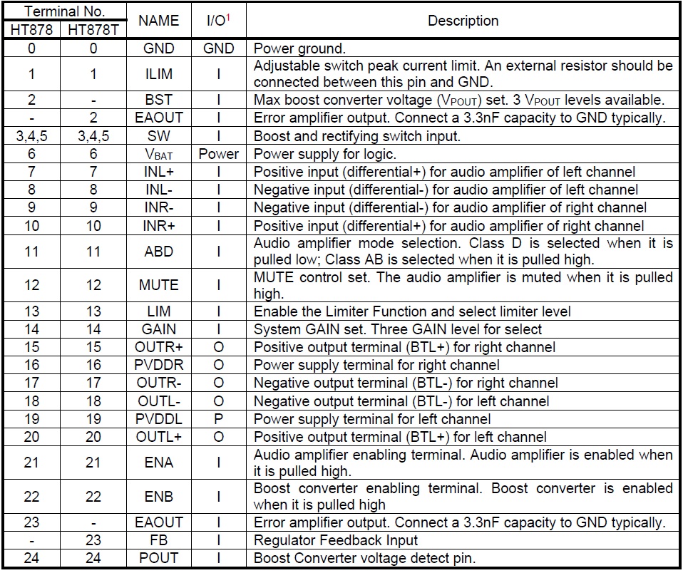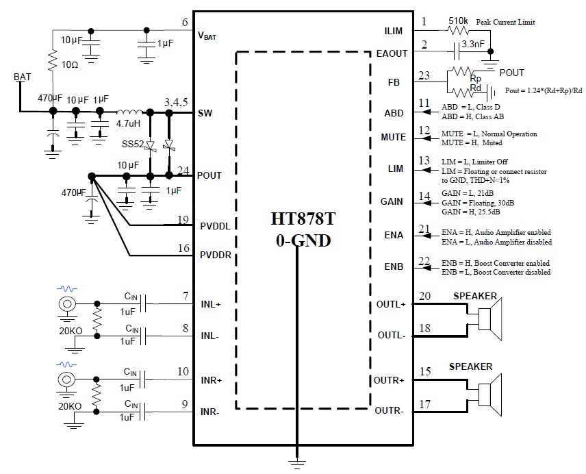 當(dāng)前位置:首頁->產(chǎn)品展示->功放IC->HT878/HT878T(可任意限幅、單節(jié)鋰電池內(nèi)置自適應(yīng)升壓8W雙聲道音頻功放IC) |