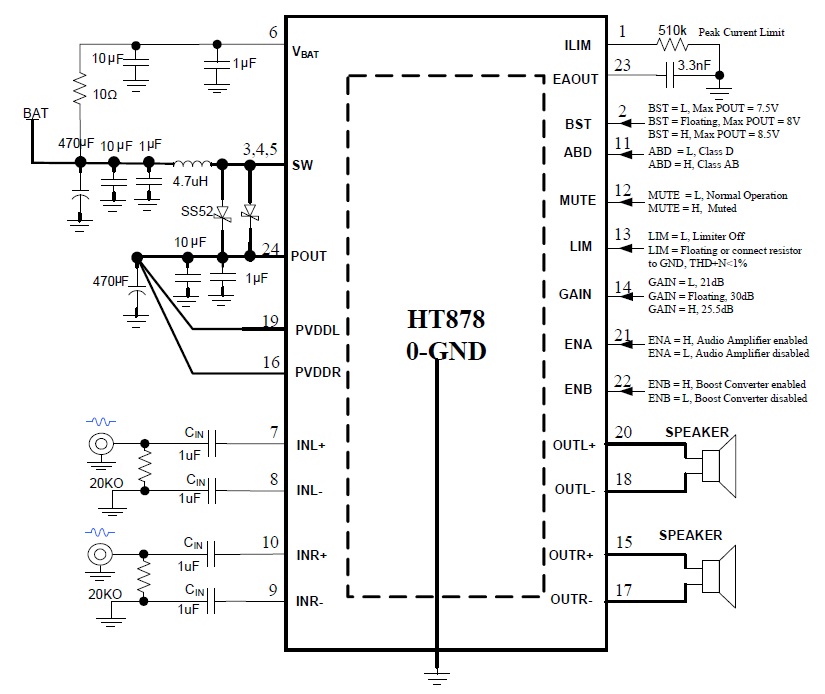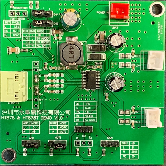 此外,HT878內(nèi)部集成免濾波器調(diào)制技術(shù),能夠直接驅(qū)動揚聲器,內(nèi)置的關(guān)斷功能使待機(jī)電流最小化,還集成了輸出端過流保護(hù)、片內(nèi)過溫保護(hù)和電源欠壓異常保護(hù)等功能。