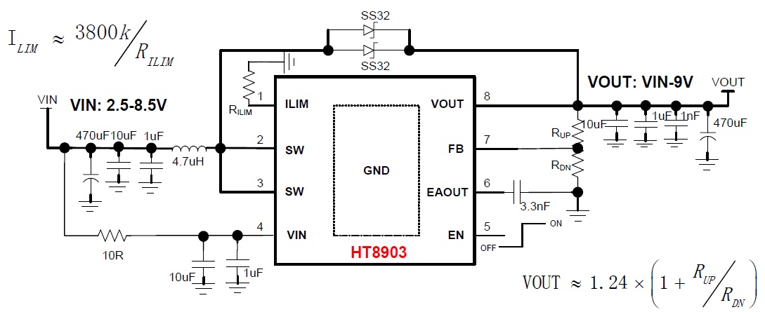 輸入電壓2.5V-8.5V;能夠提供最高9V的輸出電壓;具備8A開關(guān)電流能力. |
