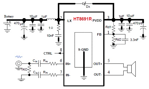 HT8691R內(nèi)部集成免濾波器數(shù)字調(diào)制技術(shù),能夠直接驅(qū)動(dòng)揚(yáng)聲器,并最大程度減小脈沖輸出信號(hào)的失真和噪音。輸出無需濾波網(wǎng)絡(luò),極少的外部元器件節(jié)省了系統(tǒng)空間和成本,是便攜式應(yīng)用的理想選擇。