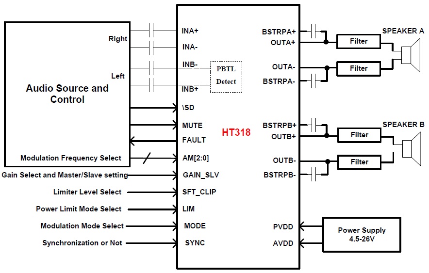 HT318是一款高效D類音頻功率放大器。在24V供電的立體聲(BTL)模式下,能夠持續(xù)提供2*40W/8Ω功率輸出;在單聲道(PBTL)模式下,能夠持續(xù)提供80W/4Ω功率輸出。