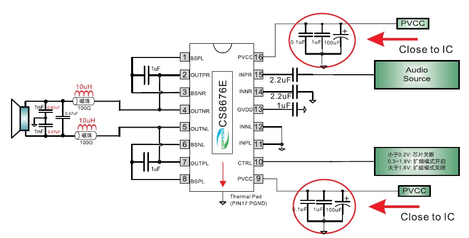 CS8676E內(nèi)置了過流保護(hù),短路保護(hù)和過熱保護(hù),有效的保護(hù)芯片在異常的工作條件下不被損壞。CS8676E可以驅(qū)動(dòng)低至4Ω負(fù)載的揚(yáng)聲器,最高可提供80W的連續(xù)功率;CS8676E具有高達(dá)92%的效率,使得在播放音樂的時(shí)候不需要額外的散熱器。