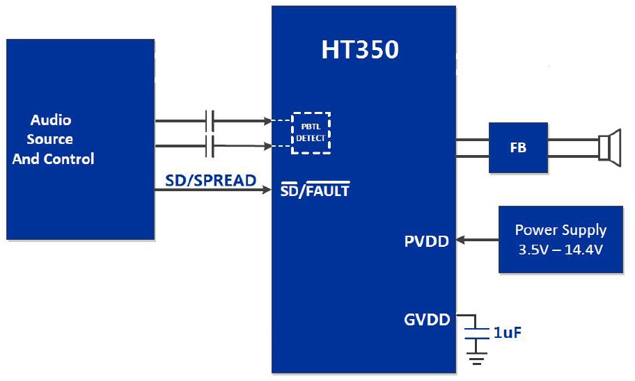 HT350是一款高效D類(lèi)音頻功率放大器。在15V供電的單聲道(PBTL)模式下,能夠持續(xù)提供30W/4Ω功率輸出。