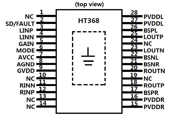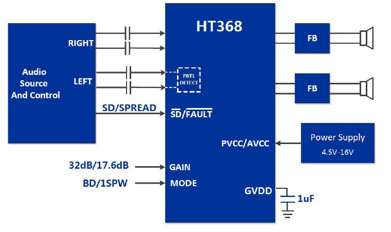 HT368 是一款高效D 類音頻功率放大器。在14.5V供電的立體聲(BTL)模式下,能夠持續(xù)提供2*20W/4Ω功率輸出;在單聲道(PBTL)模式下,能夠持續(xù)提供30W/4Ω功率輸出。