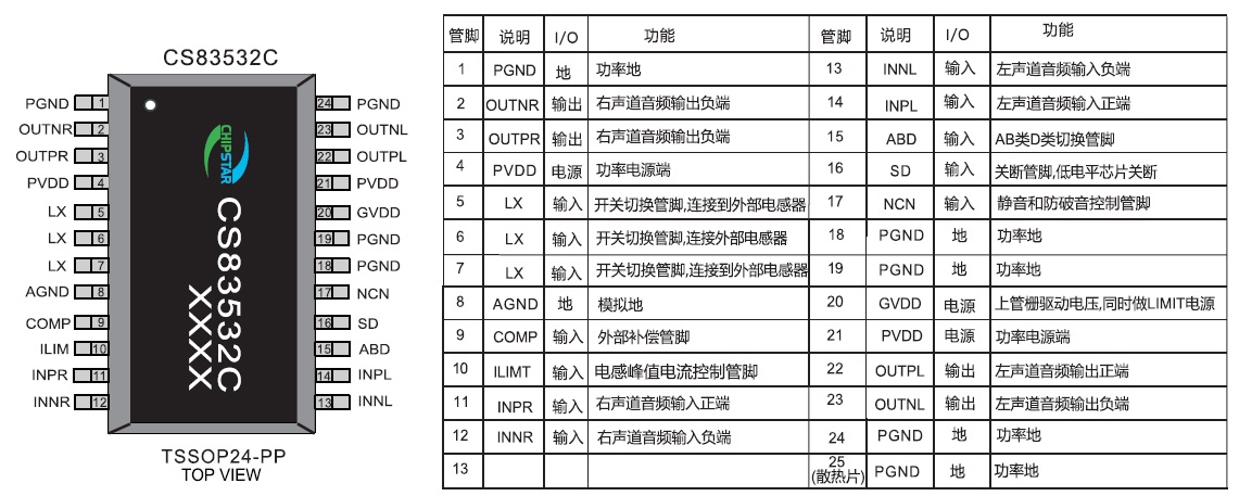 CS83532C提供了纖小的的TSSOP24-PP封裝形式供客戶選擇,其額定的工作溫度范圍為-40℃至85℃。