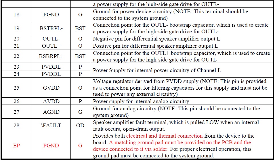 2×14W, 立體聲輸出(4Ω, 12V, THD+N = 1%); 2×10.5W, 立體聲輸出 (6Ω, 12V, THD+N = 1%) |